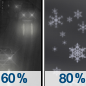 Temperature: 16°F Wind Speed: 10 to 15 mph Wind Direction: S Forecast: A slight chance of snow. Mostly cloudy, with a low around 16. South wind 10 to 15 mph. Chance of precipitation is 20%. |