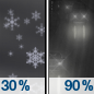 Forecast: A chance of snow. Mostly cloudy, with a high near 34. Chance of precipitation is 30%.