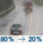 Temperature: 43°F Wind Speed: 7 to 12 mph Wind Direction: SSE Forecast: Rain. Mostly cloudy, with a low around 43. Chance of precipitation is 80%. New rainfall amounts between a tenth and quarter of an inch possible. |