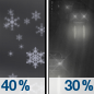 Temperature: 34°F Wind Speed: 7 to 10 mph Wind Direction: S Forecast: A chance of snow after 7am. Cloudy, with a high near 34. Chance of precipitation is 40%. New snow accumulation of less than half an inch possible. |