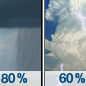 Temperature: 38°F Wind Speed: 6 to 9 mph Wind Direction: S Forecast: Showers and thunderstorms. Mostly cloudy. Low around 38, with temperatures rising to around 40 overnight. South wind 6 to 9 mph. Chance of precipitation is 80%. New rainfall amounts between a quarter and half of an inch possible. |
