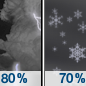 Temperature: 30°F Wind Speed: 5 to 10 mph Wind Direction: W Forecast: Rain showers before 7pm, then showers and thunderstorms likely between 7pm and 4am, then a slight chance of rain and snow showers. Mostly cloudy, with a low around 30. Chance of precipitation is 80%. |