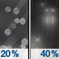 Temperature: 22°F Wind Speed: 3 mph Wind Direction: SW Forecast: Mostly cloudy. Low around 22, with temperatures rising to around 29 overnight. Southwest wind around 3 mph. Chance of precipitation is 20%. New rainfall amounts less than a tenth of an inch possible. |