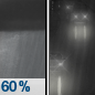 Temperature: 39°F Wind Speed: 0 to 5 mph Wind Direction: SW Forecast: Rain showers likely and patchy fog and intermittent drizzle before midnight, then patchy drizzle and patchy fog. Cloudy, with a low around 39. Chance of precipitation is 60%. |