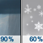 Temperature: 34°F Wind Speed: 5 mph Wind Direction: S Forecast: A chance of rain and snow showers before 1am, then a chance of rain and snow showers. Mostly cloudy. Low around 34, with temperatures rising to around 36 overnight. South wind around 5 mph. Chance of precipitation is 40%. |