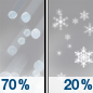 Temperature: 35°F Wind Speed: 6 mph Wind Direction: SSE Forecast: Snow likely before 7am, then a chance of snow and a slight chance of sleet between 7am and 8am, then a chance of snow and a chance of freezing drizzle between 8am and 4pm, then a slight chance of freezing drizzle and a slight chance of drizzle. Mostly cloudy. High near 35, with temperatures falling to around 32 in the afternoon. South southeast wind around 6 mph. Chance of precipitation is 70%. New snow accumulation of less than half an inch possible. Little or no ice accumulation expected. |