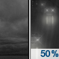Temperature: 22°F Wind Speed: 7 to 14 mph Wind Direction: S Forecast: A chance of rain after midnight. Cloudy, with a low around 22. Chance of precipitation is 50%. |
