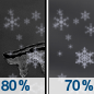 Temperature: 12°F Wind Speed: 7 mph Wind Direction: E Forecast: Snow. Mostly cloudy, with a low around 12. Chance of precipitation is 80%. |