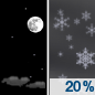 Temperature: 32°F Wind Speed: 2 mph Wind Direction: E Forecast: A slight chance of rain and snow after 4am. Mostly clear, with a low around 32. |