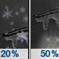 Temperature: 20°F Wind Speed: 13 mph Wind Direction: SE Forecast: Snow likely before 7pm, then snow and a slight chance of freezing rain. Cloudy, with a low around 20. Chance of precipitation is 90%. New snow accumulation of 2 to 4 inches possible. |