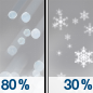 Temperature: 31°F Wind Speed: 3 mph Wind Direction: E Forecast: A chance of snow between 7am and 1pm, then snow and a slight chance of freezing rain. Cloudy, with a high near 31. Chance of precipitation is 80%. |
