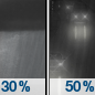 Temperature: 31°F Wind Speed: 7 to 10 mph Wind Direction: W Forecast: A slight chance of rain before 7pm. Mostly cloudy, with a low around 31. |