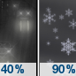 Temperature: 40°F Wind Speed: 7 mph Wind Direction: W Forecast: A chance of rain and snow. Mostly sunny, with a high near 40. Chance of precipitation is 40%. |