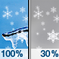Temperature: 30°F Wind Speed: 2 mph Wind Direction: SE Forecast: Snow. Cloudy, with a low around 30. Southeast wind around 2 mph. Chance of precipitation is 100%. New snow accumulation of less than one inch possible. |