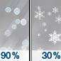 Temperature: 30°F Wind Speed: 3 to 7 mph Wind Direction: E Forecast: A chance of snow between 7am and 1pm, then snow and freezing rain and a slight chance of sleet. Cloudy, with a high near 30. Chance of precipitation is 80%. |