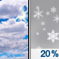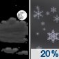 Temperature: -21°F Wind Speed: 0 mph Wind Direction: Forecast: A slight chance of snow before 9am. Partly sunny, with a high near -21. Chance of precipitation is 20%. |