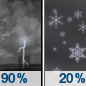 Temperature: 31°F Wind Speed: 10 to 15 mph Wind Direction: WSW Forecast: Showers and thunderstorms before 3am, then a slight chance of rain and snow showers. Mostly cloudy, with a low around 31. Chance of precipitation is 90%. |