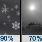 Temperature: 12°F Wind Speed: 14 to 20 mph Wind Direction: WSW Forecast: Snow before 4am, then snow likely and patchy blowing snow. Cloudy, with a low around 12. West southwest wind 14 to 20 mph. Chance of precipitation is 90%. New snow accumulation of 1 to 2 inches possible. |