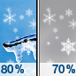 Forecast: A chance of snow. Mostly cloudy, with a low around 13. Chance of precipitation is 50%.
