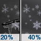 Temperature: 15°F Wind Speed: 5 to 10 mph Wind Direction: S Forecast: A slight chance of freezing rain between 10pm and 11pm, then a chance of snow. Mostly cloudy. Low around 15, with temperatures rising to around 25 overnight. South wind 5 to 10 mph. Chance of precipitation is 40%. New snow accumulation of less than half an inch possible. |