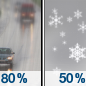 Temperature: 34°F Wind Speed: 14 to 21 mph Wind Direction: SSW Forecast: Rain and snow before 8pm, then rain and snow. Mostly cloudy, with a low around 34. Chance of precipitation is 80%. |
