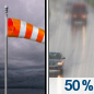 Temperature: 41°F Wind Speed: 20 to 30 mph Wind Direction: W Forecast: A chance of rain. Mostly cloudy, with a high near 41. |