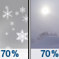 Temperature: -11°F Wind Speed: 5 to 10 mph Wind Direction: NE Forecast: Snow likely. Mostly cloudy. Low around -11, with temperatures rising to around -4 overnight. Northeast wind 5 to 10 mph. Chance of precipitation is 60%. New snow accumulation of 1 to 2 inches possible. |