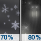 Temperature: 33°F Wind Speed: 9 mph Wind Direction: S Forecast: A slight chance of snow between 7pm and 9pm, then rain. Cloudy, with a low around 33. South wind around 9 mph. Chance of precipitation is 80%. New rainfall amounts less than a tenth of an inch possible. |
