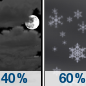 Temperature: 34°F Wind Speed: 8 mph Wind Direction: N Forecast: A chance of snow. Mostly cloudy, with a high near 34. North wind around 8 mph. Chance of precipitation is 30%. |