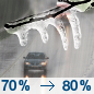 Temperature: 47°F Wind Speed: 5 to 10 mph Wind Direction: SW Forecast: Rain and a chance of freezing rain. Cloudy, with a high near 47. Chance of precipitation is 80%. |