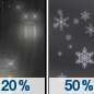 Temperature: 35°F Wind Speed: 5 mph Wind Direction: E Forecast: A slight chance of rain between 7pm and 1am, then a chance of rain and snow. Cloudy, with a low around 35. Chance of precipitation is 50%. |