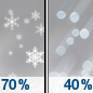 Temperature: 15°F Wind Speed: 15 mph Wind Direction: W Forecast: Snow showers likely. Mostly cloudy, with a low around 15. Chance of precipitation is 70%. |