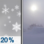 Temperature: 20°F Wind Speed: 5 mph Wind Direction: E Forecast: A slight chance of snow showers. Mostly cloudy, with a low around 20. |