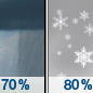 Temperature: 25°F Wind Speed: 7 mph Wind Direction: N Forecast: Rain and snow showers. Mostly cloudy, with a low around 25. Chance of precipitation is 80%. |