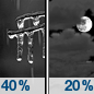 Temperature: 27°F Wind Speed: 8 mph Wind Direction: SW Forecast: A chance of freezing rain before 11pm. Mostly cloudy, with a low around 27. Southwest wind around 8 mph. Chance of precipitation is 40%. New snow accumulation of less than half an inch possible. Little or no ice accumulation expected. |