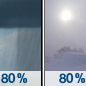 Temperature: 35°F Wind Speed: 8 to 12 mph Wind Direction: S Forecast: Snow showers before 1pm, then rain and snow showers likely. Mostly cloudy, with a high near 35. Chance of precipitation is 80%. |