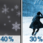 Temperature: 20°F Wind Speed: 6 mph Wind Direction: NE Forecast: A chance of snow showers. Mostly cloudy, with a low around 20. |