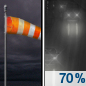 Temperature: 38°F Wind Speed: 5 to 21 mph Wind Direction: SE Forecast: Rain likely after midnight. Cloudy. Low around 38, with temperatures rising to around 52 overnight. Southeast wind 5 to 21 mph, with gusts as high as 40 mph. Chance of precipitation is 70%. New rainfall amounts between a tenth and quarter of an inch possible. |